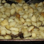 PreheatĀ your oven to 375 degrees. Take out a large, rimmed baking sheet and set aside. Peel and cut potatoes into chunks and place on the sheet pan. Whisk together the oil, spices and garlic, drizzle over the potatoes and mix well.